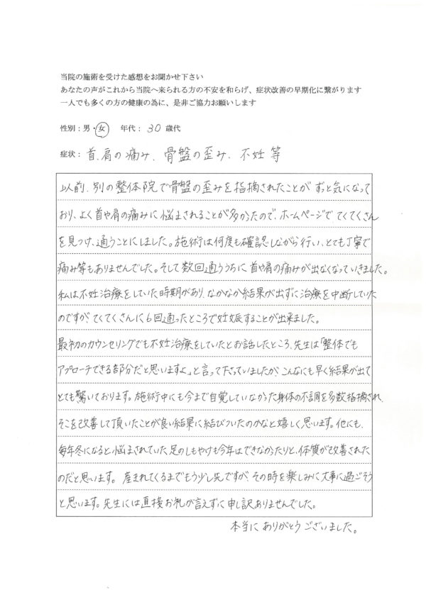 以前、別の整体院で骨盤の歪みを指摘されたことがずっと気になっており、よく首や肩の痛みに悩ま...