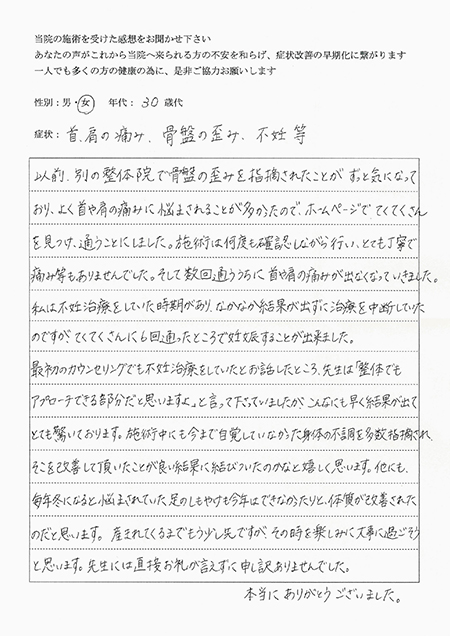 当院へお越しいただいた際の主訴は不妊ではありませんでしたが、初回に「何度か不妊治療を行っているのですが、疲れてしまったので今はちょっとお休みしているんです」というお話しを伺ったため、不妊対応もかなり意識して施術を進めていきました。